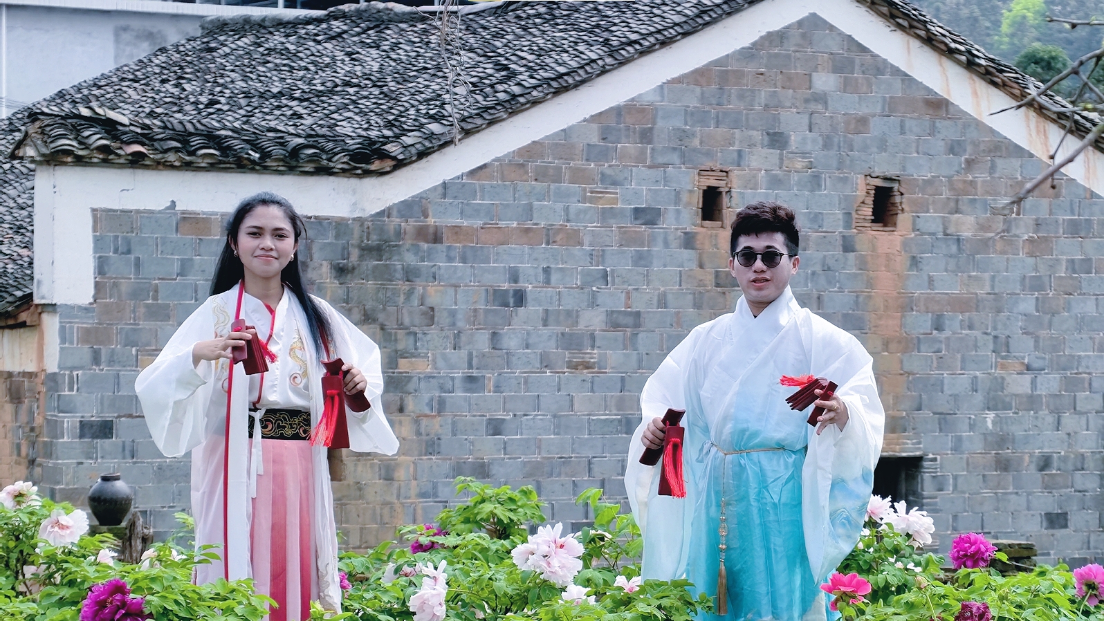 诗会在牡丹芬芳与悠扬弦乐中拉开帷幕。我校留学生与其他高校留学生携手登台,用中英双语交替朗诵《国色牡丹》,将牡丹的雍容之态与东方诗意娓娓呈现。随后,他们走进盛开的牡丹园,在花海与古村之间打起快板、唱诵牡丹,以新颖活泼的形式沉浸式体验中国诗词的意境之美与田园生活的诗意悠然。