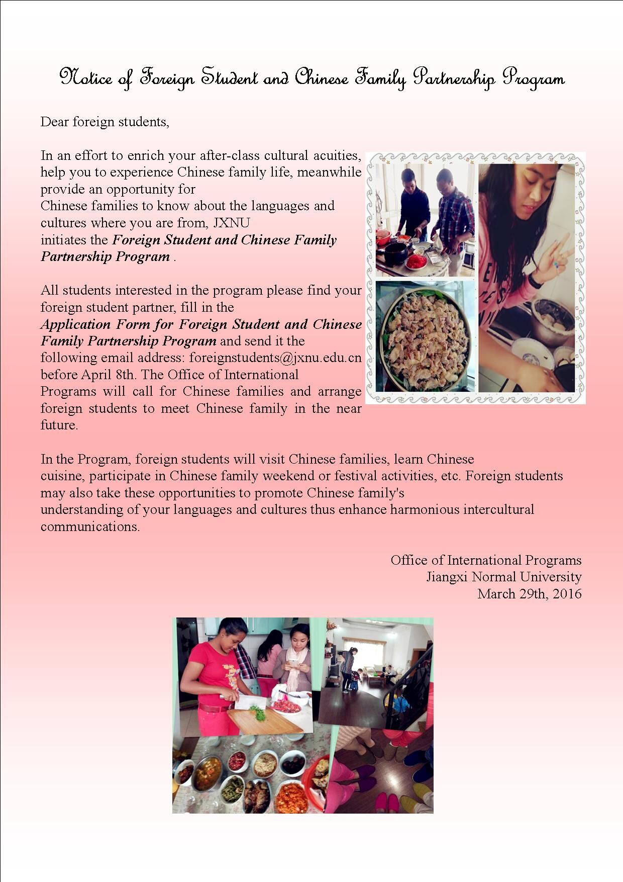 Notice of foreign student and chinese family partenarship program